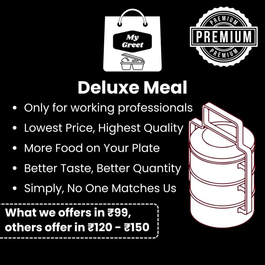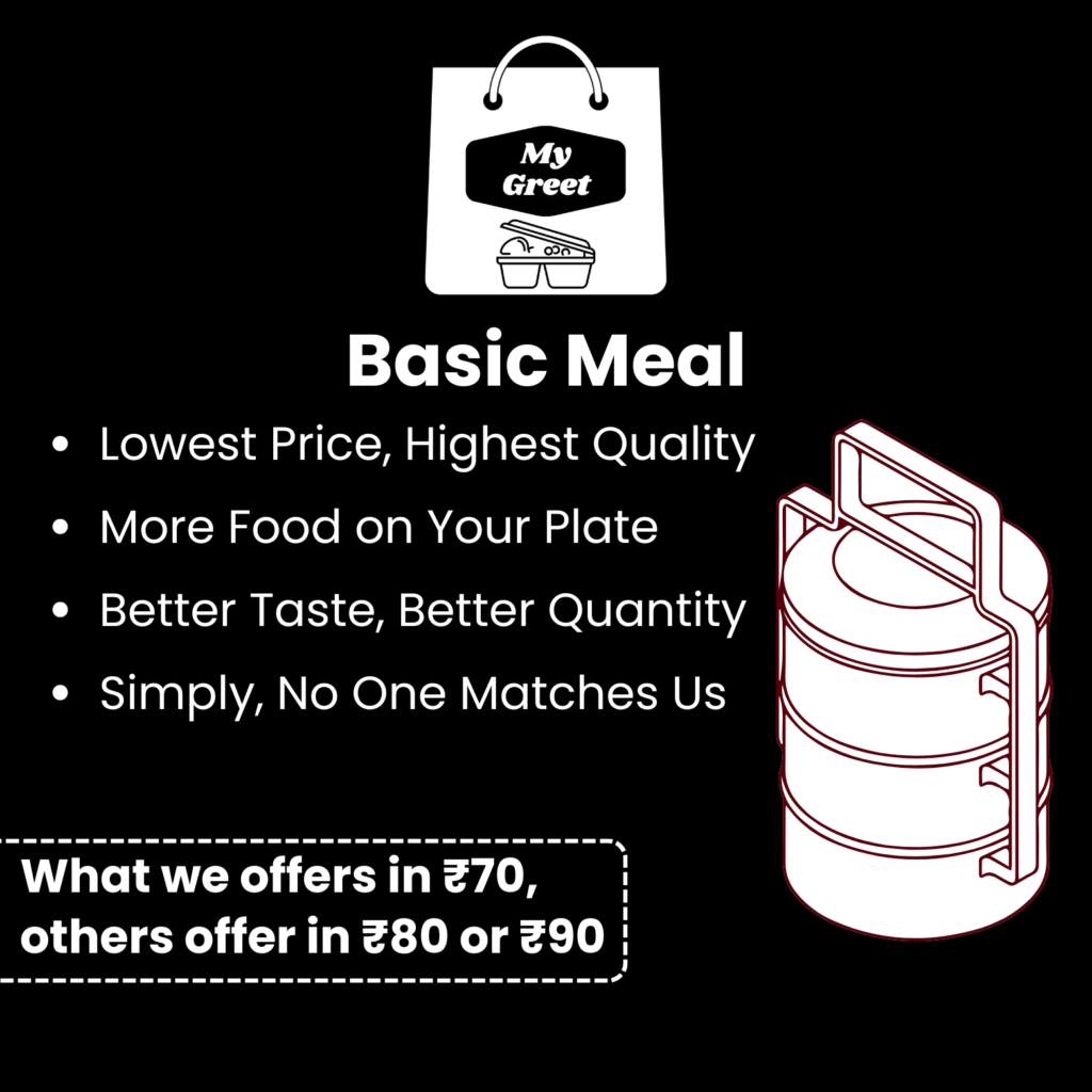 • यदि आप कम से कम 15 दिनों का एडवांस भुगतान करते हैं और सप्ताह में न्यूनतम 5 दिन टिफ़िन लेते हैं, तो शुल्क केवल ₹60 / ₹70 प्रति टिफ़िन होगा।